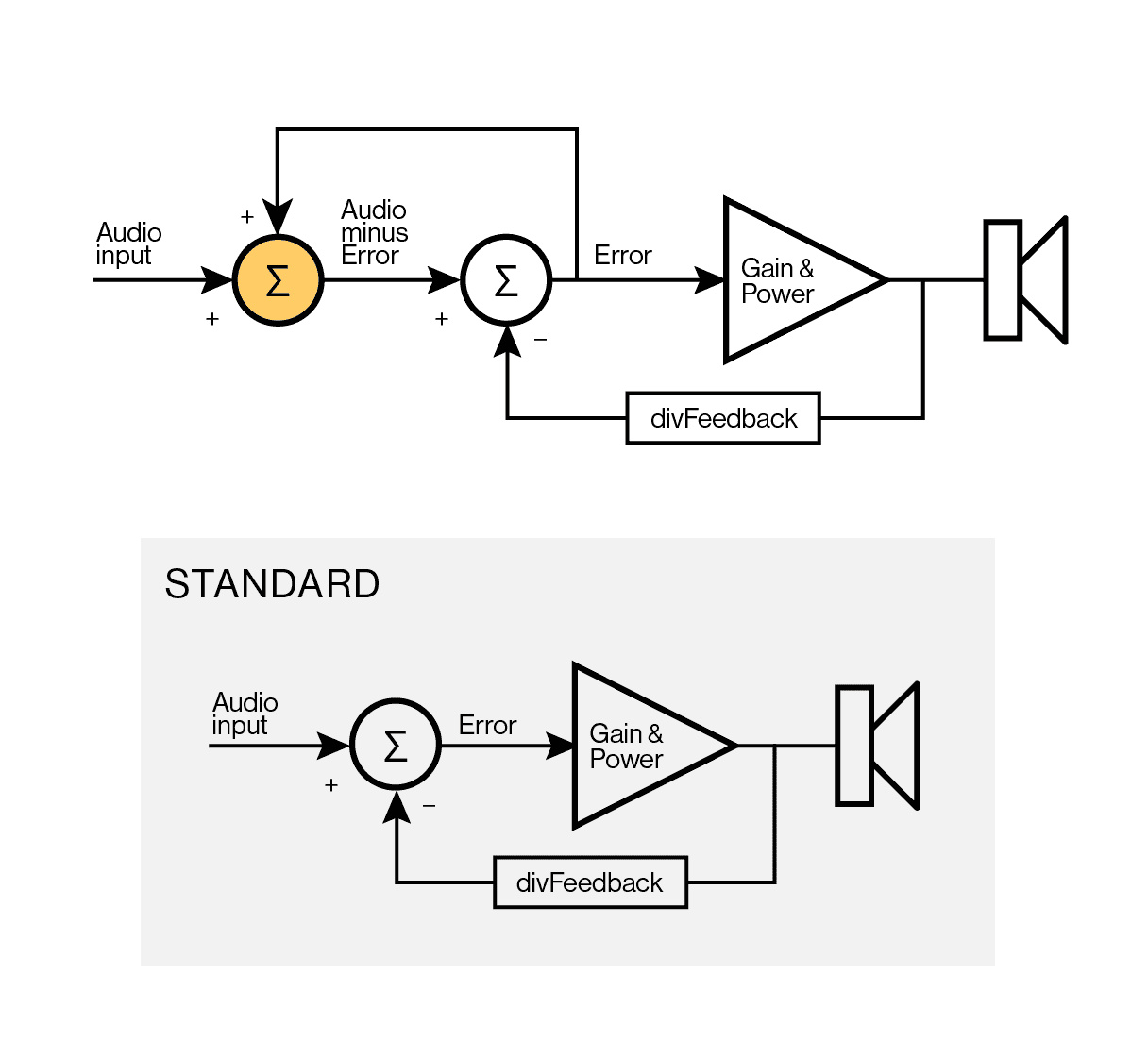 La sección del amplificador de potencia del WSH-605 se basa en tecnología avanzada de corrección de errores, poco común en diseños de audio. Implementar la corrección de errores de ganancia directamente en la etapa de potencia permite una fidelidad de sonido excepcional con mínima distorsión armónica y de intermodulación. Esta solución elimina las limitaciones típicas de los circuitos de retroalimentación tradicionales. La corrección es global, lo que permite una compensación precisa de diversos tipos de distorsión a lo largo de toda la ruta de la señal.