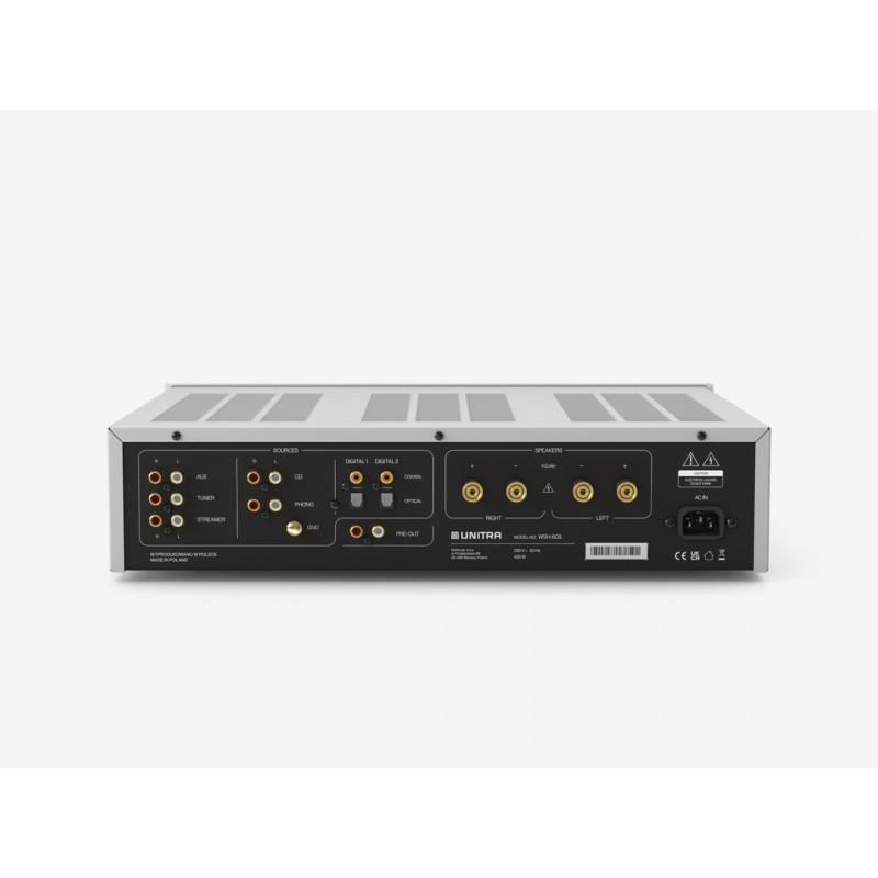 El WSH-605 es un amplificador estéreo dinámico y de sonido natural que ofrece 110 watts por canal en Clase AB. Fabricado en Polonia según rigurosos estándares de ingeniería, sigue un concepto de diseño modular y ofrece entradas analógicas y digitales (incluida una entrada de phono), un amplificador de auriculares dedicado y un preamplificador con un DAC ESS Sabre. Además, cuenta con una sofisticada tecnología de corrección de errores, baja distorsión armónica, alto factor de amortiguamiento y funciones de seguridad avanzadas.
